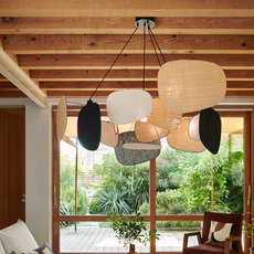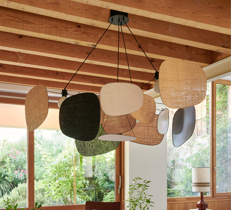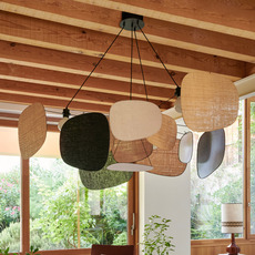 Voici la suspension 4 lumières XXL finitions lin bouleau, raphia et lin noir doublée de la collection Screen 70’s proposée par la maison Market Set !