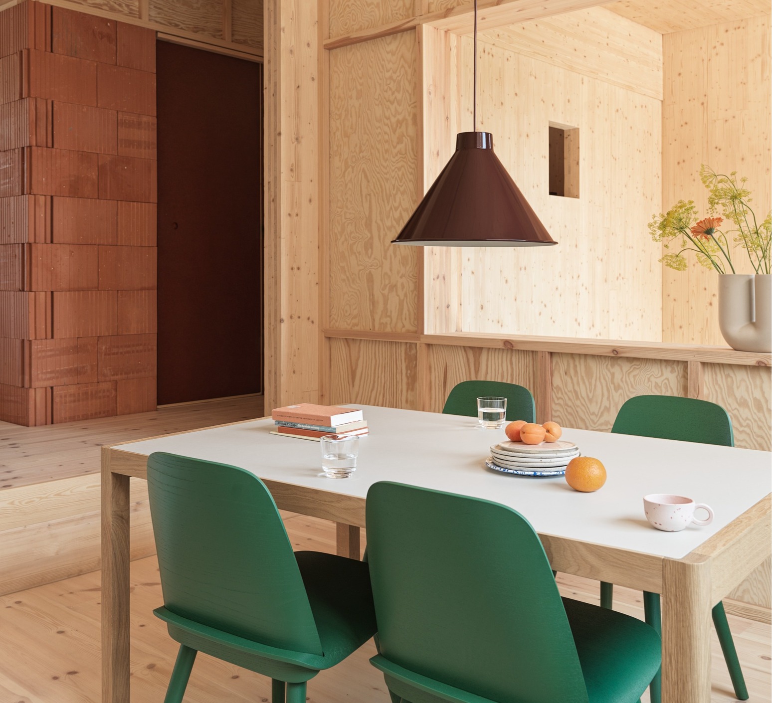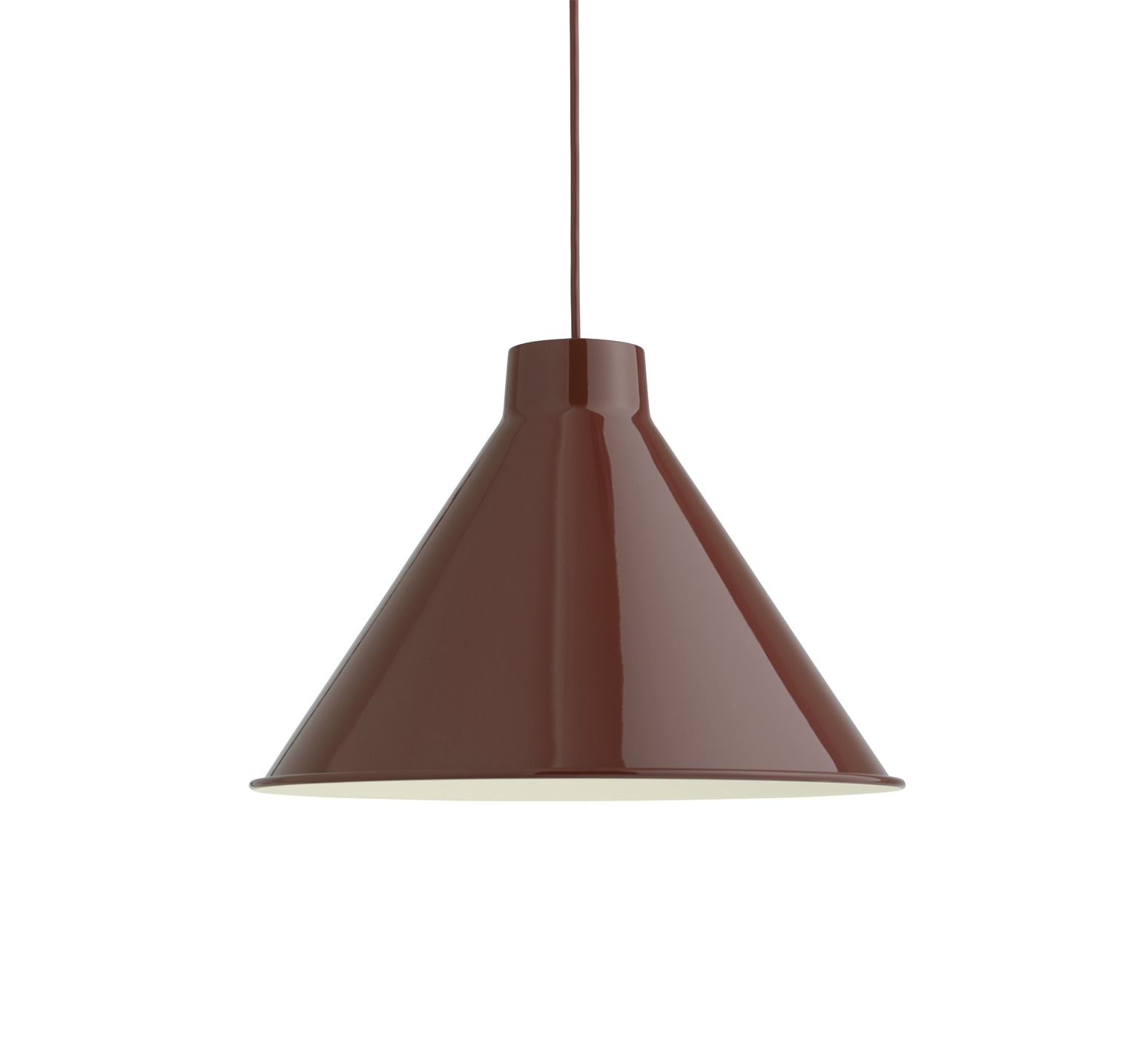La suspension Top, d'un diamètre de 38 cm et d'une finition rouge foncé, a été imaginée par le studio suisse Big-Game pour la maison danoise Muuto.