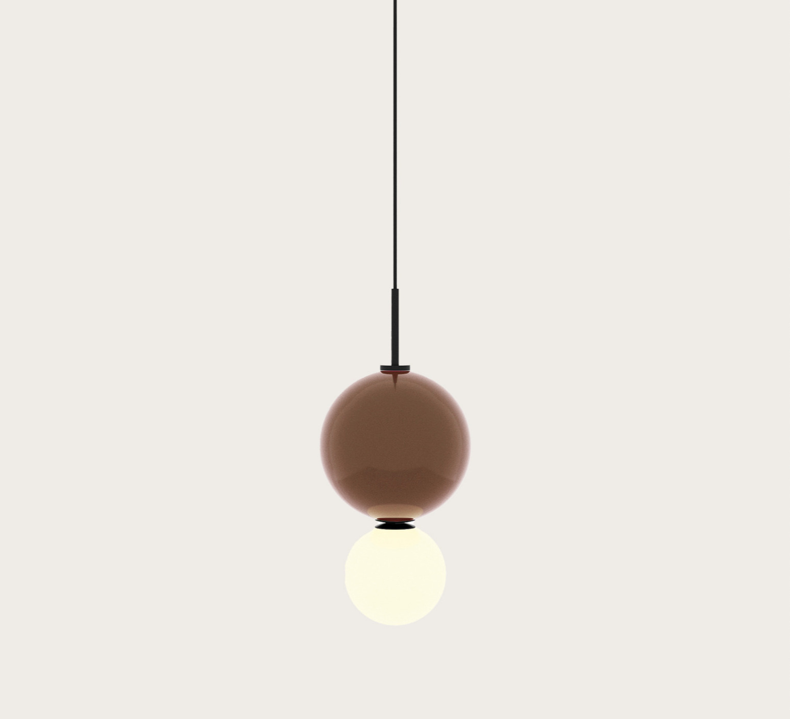 L’ensemble évoque deux bulles lumineuses, une sphère plus petite en verre opalin qui abrite la source lumineuse accolée à une sphère plus grande en verre coloré, donnant à ce luminaire une présence aérienne et poétique qui rappelle des bulles de lumière suspendues dans l’espace.