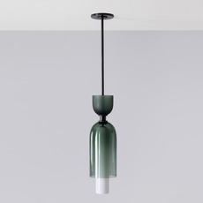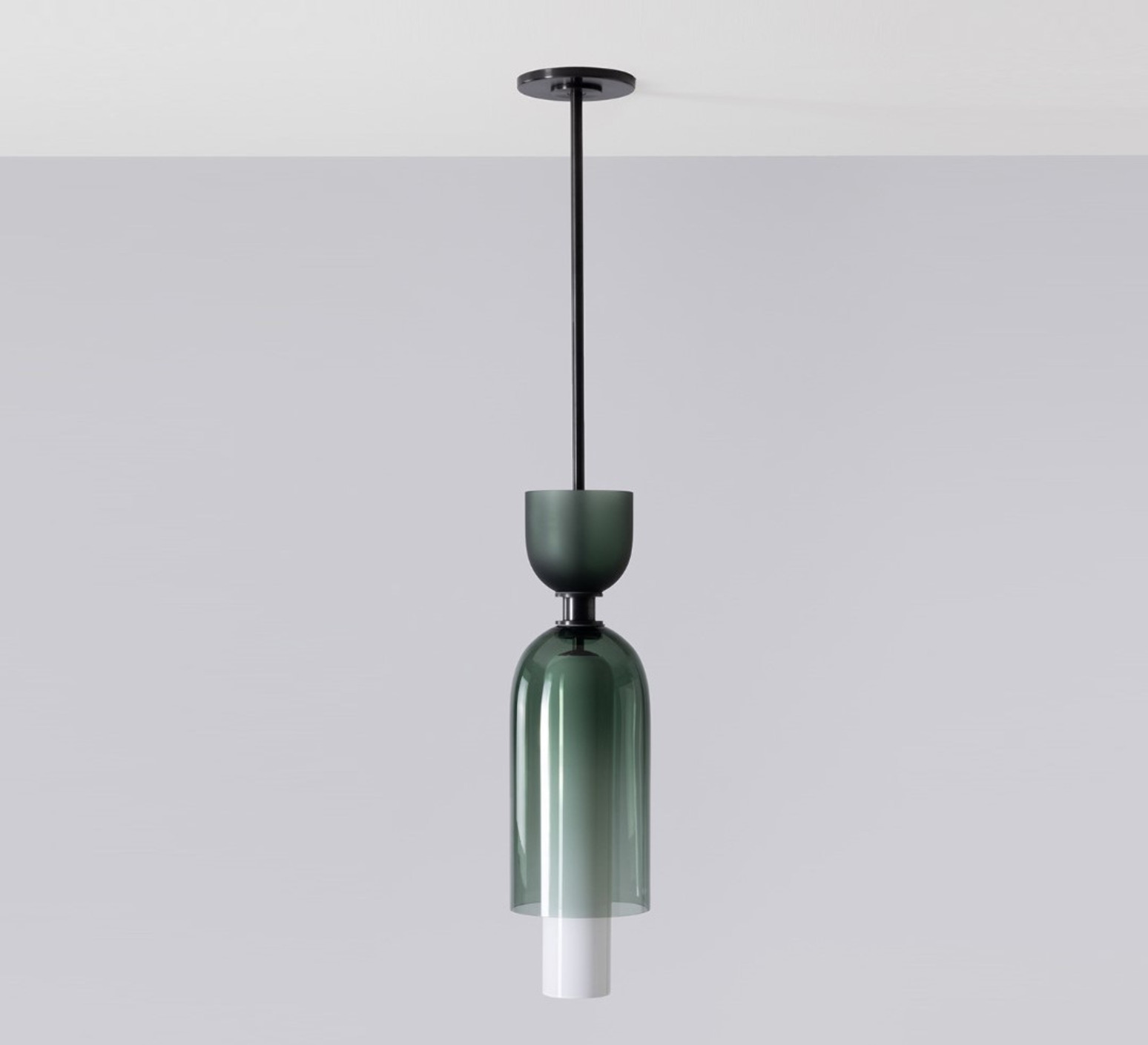 Son design cylindrique superpose trois dômes de verre aux textures et transparences contrastées. Le dôme inférieur allongé en verre opaque blanc accueille la source lumineuse, enveloppé par un dôme grisé, tandis qu'un dôme supérieur en verre gris givré vient équilibrer l'ensemble, séparé par un élément central en laiton finement détaillé. Cette suspension s'impose avec élégance au-dessus d'une table, dans un volume généreux ou en point focal d'un espace.